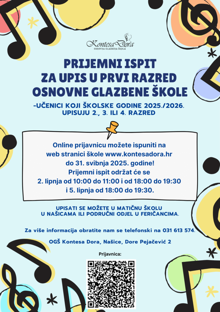 Pozivamo Vas da se elektronskim putem prijavite za polaganje prijemnog ispita za upis u 1. razred Osnovne glazbene škole Kontesa Dora u školskoj godini 2025./2026.!