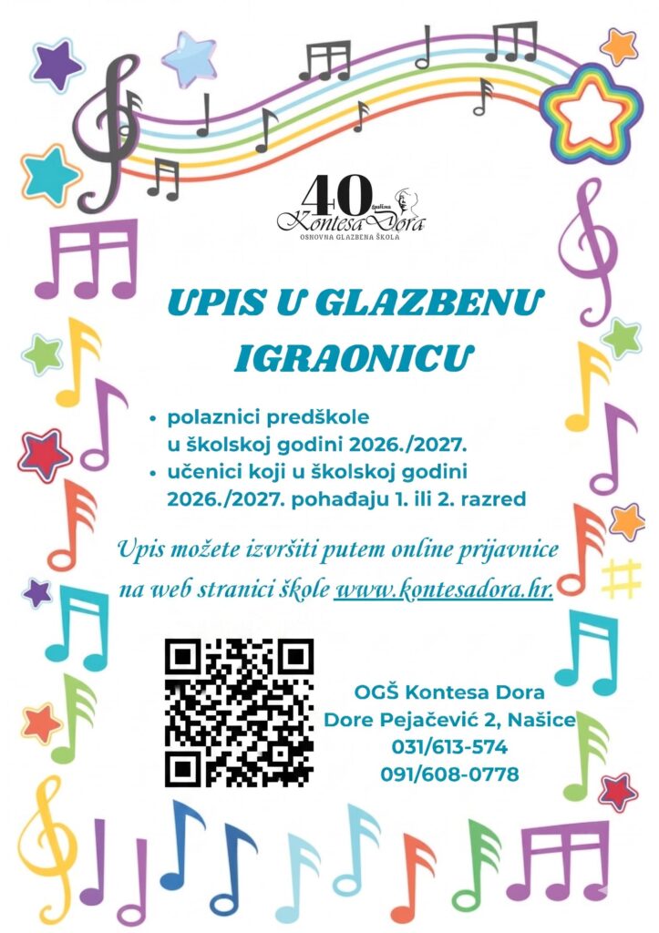Pozivamo Vas da se elektronskim putem prijavite u Glazbenu igraonicu Osnovne glazbene škole Kontesa Dora u školskoj godini 2026./2027.!