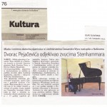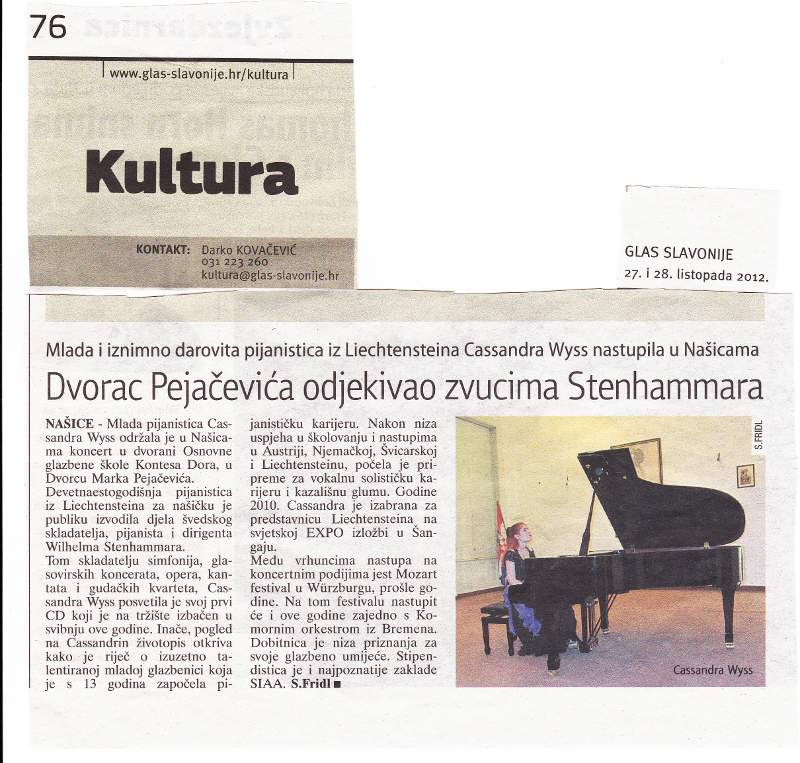 Sinoć je u koncertnoj dvorani Osnovne glazbene škole “Kontesa Dora” koncert održala švicarska pijanistica Cassandra Wyss. Interpretacijama skladbi jednog od najpoznatijih švedskih skladatelja, pijanista i dirigenta Wilhelma Stenhammara, oduševila je publiku. Dobrodošlicu u Našice, devetnaestogodišnjoj pijanistici koja je karijeru započela sa samo 13 godina Bachovim koncertom za klavir u f-molu, poželjela je ravnateljica glazbene škole, Marina Kopri. Cassandra Wyss jedna je od budućih zvijezda klasične glazbe u Europi s karijerom u usponu, a osim na brojnim nastupima diljem Europe, zapažena je i u Kini. Od 2009. godine intenzivnije se posvećuje komornoj glazbi. 2011.godine izdaje svoj prvi CD s intepretacijama djela koje je izvela sinoć u Našicama. Cassandra Wyss rekla je kako je jako sam sretna što je u Našicama i što može predstaviti svoj novi program, švedskog kompozitora Stenhammara. Prošle je godine snimila svoj prvi CD s njegovim kompozicijama i drago joj je što ga može predstaviti i u Našicama. Govoreći o planovima, najavila je kako će sljedeće godine biti objavljen još jedan CD s njegovim kompozicijama, a svirat će i s orkestrom Rahmanjinov koncert za klavir.